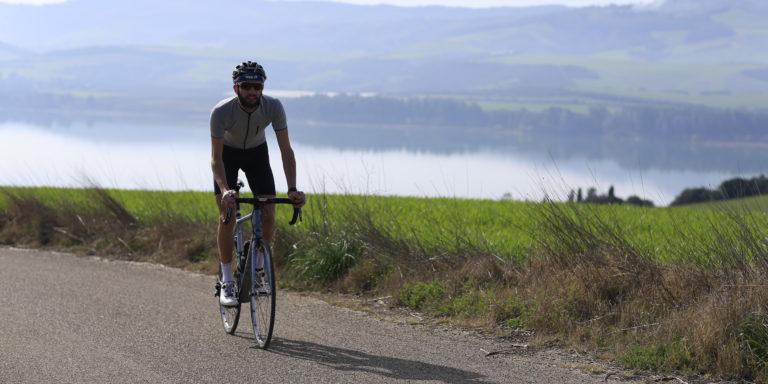 “L’alta Murgia si sta svegliando dall’inverno. I prati dell’altopiano colorati dai mandorli in fiore sono spazzati da un vento umido a causa della pioggia caduta nella notte. La strada per Minervino è circondata da decine di pale eoliche che vorticano all’unisono. A passarci sotto il rumore delle pale copre quello delle biciclette. Il nostro viaggio è appena iniziato.”